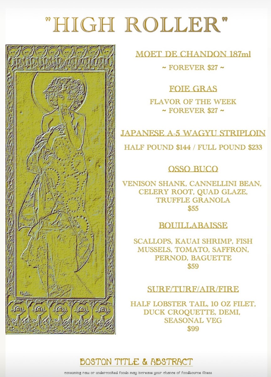 Welcome to Boston Title & Abstract, a hidden gem located at 522 S Boston Ave, Suite B100, Tulsa, OK. This unique venue offers not just a dining experience, but a celebration of culinary artistry. Upon entering, patrons are greeted with a glass of Prosecco, setting the stage for what's to come.